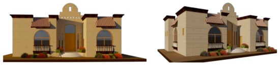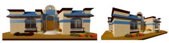 In this 3D BIM model, the specifications of the used construction materials of the walls, the roof, and the windows of the house were accurately defined. The 20 cm thick self-insulated hollow core CMU with added 2 cm thick external and internal cement plastering layers give external walls a total thickness of 24 cm with a cumulative U-value of 0.11 W/m2·K. Meanwhile, the total thickness of the roof reached 30 cm, including a 5 cm thermal insulation layer, giving a U-value of 0.09 W/m2·K. The windows were modeled as double glazed with aluminum metal framing, giving a U-value of 2.80 W/m2·K. Table 1 shows the specifications of the components of the house walls, roof, and windows.