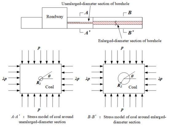 The segmented enlarged-diameter borehole is divided into an unenlarged-diameter section and enlarged-diameter section (Figure 1). The enlarged-diameter section is located in the elastic zone, which was outside the anchorage layer of the surrounding rock. The axial length of the pressure relief borehole is much greater than its radius, so the borehole can be analyzed as a plane strain problem. The vertical and horizontal stresses subjected to the pressure relief borehole are simplified as uniformly distributed stresses (Figure 1).