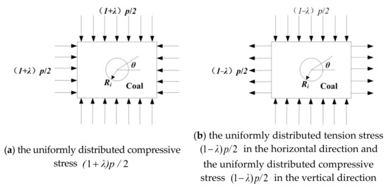 According to the superposition of elasticity, the load of an unenlarged-diameter section and enlarged-diameter section of borehole can be divided into two parts: the uniformly distributed compressive stress (Figure 2a); the uniformly distributed tension stress in the horizontal direction and the uniformly distributed compressive stress in the vertical direction (Figure 2b).