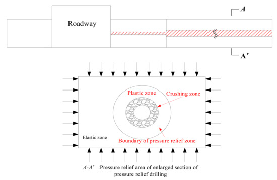 Due to stress concentration at the edge of the borehole, the coal around the borehole forms a broken zone, a plastic zone, and an elastic zone (Figure 3). The broken zone and the plastic zone around the borehole are collectively called the pressure relief zone, and the boundary line of the plastic zone is the boundary line of the borehole pressure relief zone.