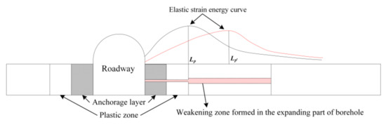 If the pressure relief is excessive, the overall roadway stability may be affected. Therefore, a segmented enlarged-diameter borehole destressing mechanism is proposed based on conventional large-diameter pressure relief technology (Figure 5). For the unenlarged-diameter section, the small diameter of the borehole can reduce the damage to the roadway support system and shallow surrounding rock. While for the enlarged-diameter section, it can form a large broken zone around the borehole far from the anchorage area, transferring the stress concentration to the deep coal body.
