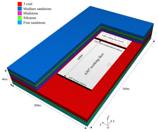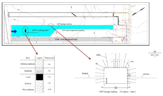 Tangkou Coal Mine is located in Nanzhang Town, Jining City, Shandong Province, and the 6307 working face (Figure 6a) of Tangkou coal mine was analyzed in this study. The thickness of coal seam is 8.1 m–10.4 m, and the burial depth of the 6307 working face is approximately 980 m. Fully mechanized top coal caving with strike longwall retreating is used to mine the 6307 working face. The roof and floor strata of the coal seam are composed of relatively complete medium sandstone and siltstone (Figure 6b). The roadway is excavated along the coal seam floor with a section size of 5400 × 3800 mm, and a both anchor, net, and cable supports are used (Figure 6c).
