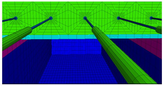 A FLAC3D numerical model was constructed based on the 6307 working face. The size of the model is 340 m × 200 m × 46 m (Figure 7). Considering the burial depth of the working face, a uniform distribution load of 23 MPa was applied at the top to simulate the weight of overlying strata. Rock type and mechanical parameters were selected based on mine geology reports and laboratory test results (Table 1). The large-diameter borehole was placed to the side of the coal side of the roadway. The mesh around the borehole is shown in Figure 8.