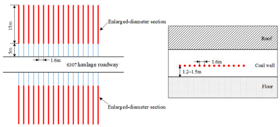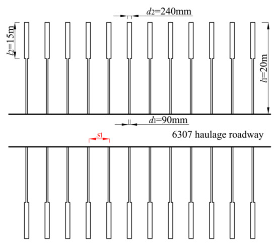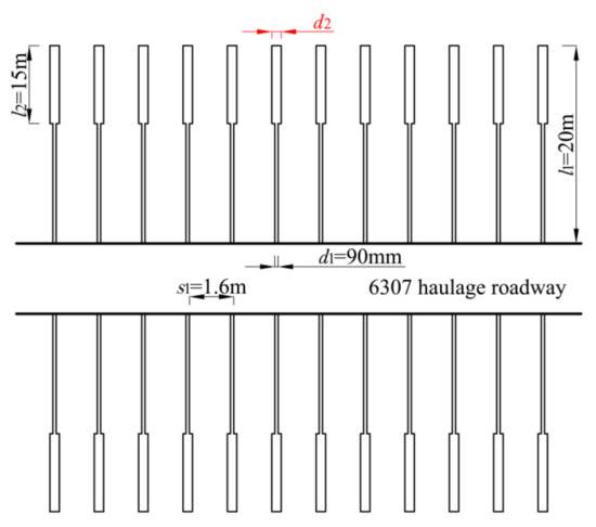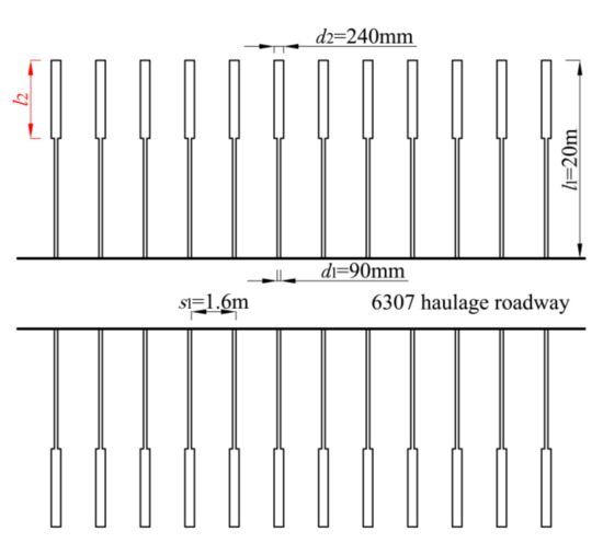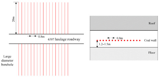 The burial depth of the 6307 working face in Tangkou coal mine is approximately 980 m. After roadway excavation, a conventional large diameter borehole is constructed on the roadway side. According to the initial design scheme, the pressure relief borehole is 1.2–1.5 m away from the coal seam floor, with a 150 mm diameter, 20 m depth, and 0.8 m space, (Figure 20).