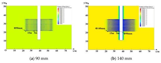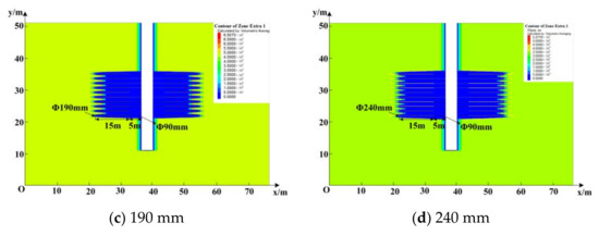 Under the same total borehole length, length of the enlarged-diameter section, diameter of the unenlarged-diameter section, and borehole space, enlarged-diameter sections with diameters of 90 mm, 140 mm, 190 mm, and 240 mm were selected to investigate the pressure relief effect and roadway deformation (Figure 9) (Table 2).