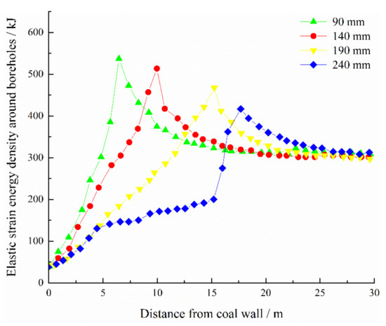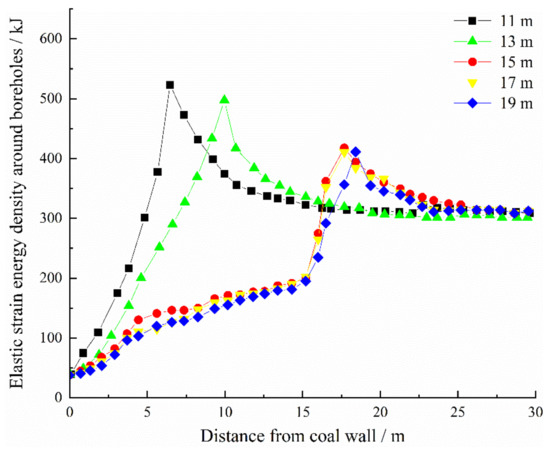 Distribution curves of elastic strain energy density around boreholes under different borehole space.