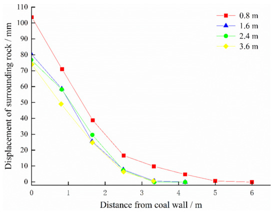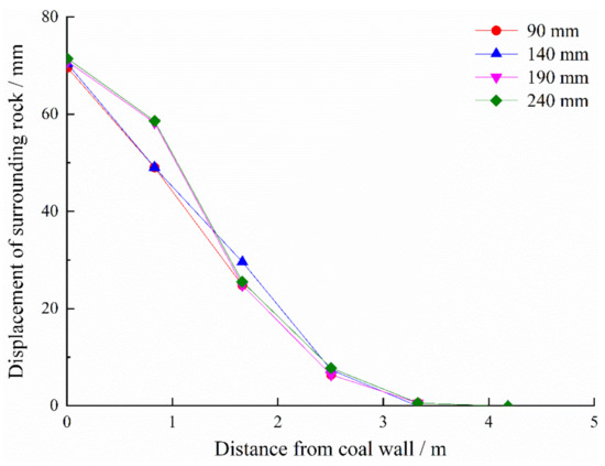 Figure 19 shows the roadway displacement curves for different borehole spaces. With decreasing borehole space, displacement on both sides of the roadway increases. When the borehole space was 0.8 m, the displacement was 103.3 mm. Compared with a borehole space of 0.8 m, the displacements of surrounding rocks (0 m away from roadway, Figure 19) under a borehole space of 1.6 m, 2.4 m, and 3.2 m decreased by 23.3%, 25.6%, and 28.3%, respectively.