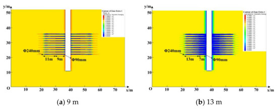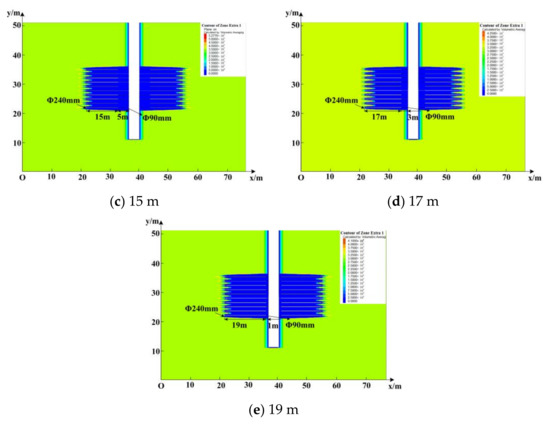 Under the same total borehole length, diameter of the unenlarged-diameter section, diameter of the enlarged-diameter section, and borehole space, enlarged-diameter sections with lengths of 11 m, 13 m, 15 m, 17 m, and 19 m were selected to investigate the pressure relief effect and roadway deformation (Figure 10) (Table 3).