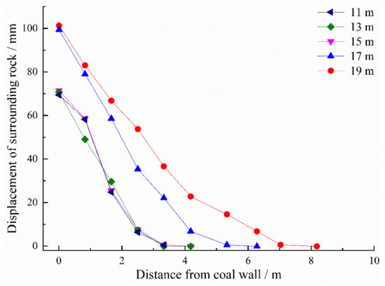 Figure 17 shows the displacement curves of surrounding rocks under different lengths of the enlarged-diameter section. The displacement variation of the two sides of the roadway under the conditions of enlarged-diameter borehole lengths of 11 m, 13 m, and 15 m was similar. When the length of enlarged-diameter section was longer than 15 m (17 m and 19 m, Figure 17), the displacement of the two sides of the roadway (0 m away from the roadway side, Figure 17) increases by 42.9%.