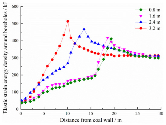 Figure 18 shows the distribution curves of elastic strain energy density around boreholes under different borehole spaces. With decreasing borehole space, the peak strain energy density decreases significantly. When the borehole space was changed from 3.2 m to 0.8 m, the peak elastic strain energy density decreased by 19.6%. The pressure relief effect for a borehole space of 1.6 m and 0.8 m was the same.