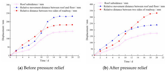 Figure 21 shows the displacement monitoring results of the roadway before and after the borehole pressure relief. At the initial monitoring stage, the deformation of surrounding rock increased significantly and entered the stable stage after 15 days (Figure 21). Before and after pressure relief, the displacement between roof and floor is the same, while the displacement between the two sides of the roadway after pressure relief is 1.8 times that before pressure relief.