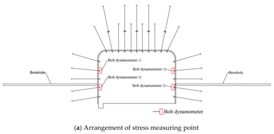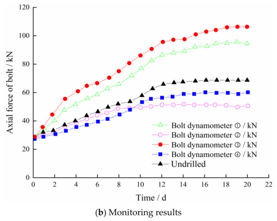Figure 22 shows the stress monitoring results of bolts before and after borehole pressure relief. At the initial stage of monitoring, the bolt stress increased significantly, then remained at a relatively stable value after 15 days (Figure 22). Where no pressure relief borehole were constructed, the stress on the two sides of the roadway stabilized at 70 kN (Figure 22). For the borehole pressure relief zone, the final stress of bolt ②, bolt ①, bolt ④, and bolt ③ is 49 kN, 94 kN, 60 kN, and 105 kN, respectively (Figure 22b), and the stress of the bolt near the borehole pressure relief zone is far less than that far from the pressure relief zone.
