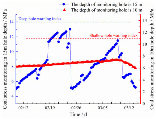 Figure 24 shows the coal stress monitoring results obtained using the stress online monitoring system (the stress gauges for the shallow hole and deep hole were arranged between the two segmented enlarged-diameter pressure relief boreholes). The early warning indices are also presented in Figure 24.