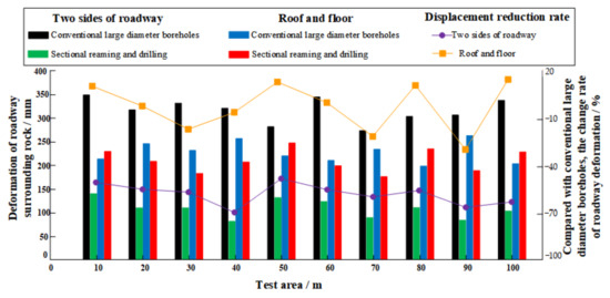 After the segmented enlarged-diameter borehole pressure relief was implemented, 10 monitoring sections were arranged to monitor the displacement of the roof, floor, and roadway side. The monitoring data were compared with the roadway deformation data in the zone where the conventional large-diameter boreholes pressure relief were implemented (Figure 25).