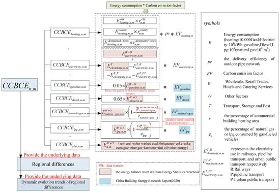 CCBCE mainly derives from various energies consumed during the building operation phase, such as raw coal, natural gas, electricity, LPG (liquefied petroleum gas), etc. We calculate the carbon emissions from each energy separately, then sum them up to get CCBCE. The calculation procedure and relevant symbols of CCBCE are shown in Figure 1.