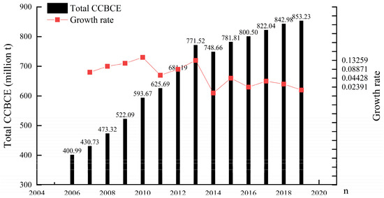 Figure 2 shows the total CCBCE levels and growth rates in 2006–2019. Overall, the total CCBCE had an upward trend during the study period, rising from 400.99 million t in 2006 to 853.23 million t in 2019, and the total CCBCE of 2019 was more than double that of 2006. However, the growth rate of total CCBCE had gradually declined, from 7.42% to 1.22%, which indicates that the total CCBCE will have a chance to peak in 2030. The total CCBCE showed a slight drop in 2014, to 748.66 million t from 771.52 million t in 2013. This may be attributed to several causes. First, China and the U.S. signed China-U.S. Joint Statement on Climate Change in 2014 [6]. Second, Energy Conservation Priority was established as the primary energy strategy by the National Energy Commission in 2014, and the Coal Power Energy Saving and Emission Reduction Upgrade and Renovation Action Plan started implement across the China [28]. Third, in 2014, the promulgation of Renovation of Old Pipe Networks for Urban Central Heating in Northern Heating Areas [45] and National New Urbanization Plan (2014–2020) [46] also promoted energy conservation and low-carbon development. China has successively formulated many strategic documents since the 18th National Congress of the Communist Party of China (2012), such as the National Climate Change Plan (2014–2020) and Enhanced Actions on Climate Change: China’s Intended Nationally Determined Contributions. China’s carbon emission growth rate significantly reduced under the guidance of these documents. The annual growth rate of CCBCE dropped from 9.2% (the “11th FYP” period) to 2.2% (the “13th FYP” period).