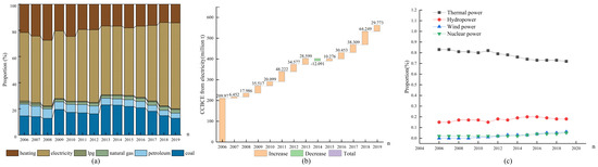 The sources of total CCBCE in 2006–2019. Note: (a) expresses changes in the proportion of CCBCE from each type of energies, (b) expresses changes in CCBCE from electricity, (c) expresses changes in the proportion of electricity generated by each power generation method.