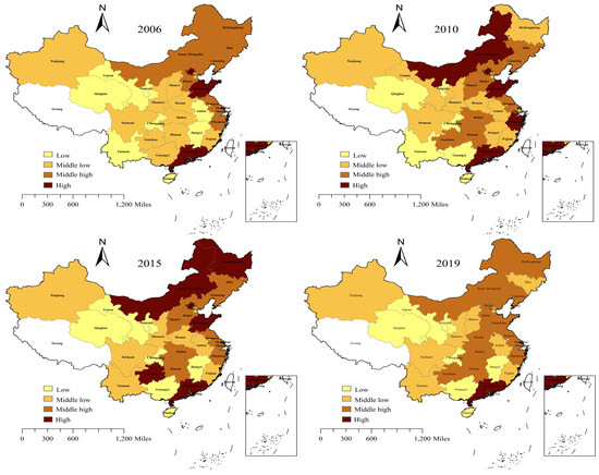 According to Section 3.1, we calculated the CCBCE in each province and drew respectively the geographic distribution map in 2006, 2010, 2015, and 2019 using ArcGIS 10.7 (See Figure 4). These provinces were divided into four levels using the method of natural fracture classification: “high emission provinces”, “middle high emission provinces”, “middle low emission provinces”, and “low emission provinces”. This method has been widely used by numerous scholars, such as Jiang et al. [47], Li et al. [48], and Peng [29]. The spatial distribution is shown in Figure 4.