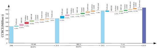 Figure 5 shows the contribution of eight comprehensive economic zones to increments of total CCBCE. At the regional scale, the contribution of different economic zones to the increase of CCBCE was different, and the contribution changed over time. From 2006 to 2010, the total CCBCE increased 192.68 Mt, approximately 48.05%. The contribution of the Northern coastal region was 27.46%, the largest one of the eight economic zones. By comparison, the contribution of the Eastern coastal and the Northwest regions were lower than other regions, and the contribution rates were respectively 1.13% and 3.83%. The Northeast contributed the most CCBCE in 2010–2015, increasing to 31.93% from 6.29%. The contribution of Northern coastal dropped significantly, from 27.46% in 2006–2010 to 2.23% in 2010–2015. The Northwest contributed the smallest CCBCE in 2010–2015, which could be due to the lower urbanization rate caused by slower economic growth. In 2015–2019, the CCBCE increased to 71.43 million t, with the lowest increase rate in three periods. Moreover, the CCBCE of both Northeast and MRYER presented negative growth, and the contribution of Northern coastal also changed from the largest in 2006–2010 to the smallest in 2015–2019. This finding further illustrates that China has implemented carbon emission reduction strategies for areas with high carbon emissions in the past ten years. It is not difficult to see that the CCBCE of the eight comprehensive economic zones demonstrate obvious differences.