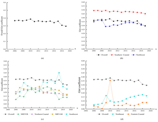 In the middle zone, the Gini coefficient of MRYER and MRYAR was constantly fluctuating in 2006–2019, and the fluctuation ranges were respectively 0.1091–0.2711 and 0.1815–0.2756. The Gini coefficient of Northern coastal showed an upward trend in 2006–2012, rising from 0.2071 in 2006 to 0.2561 in 2012, following a downtrend in 2012–2019, dropping from 0.2561 in 2012 to 0.1642 in 2019. Overall, the Gini coefficient of Southwest showed a fluctuating increasing trend in 2006–2019, from 0.1844 in 2006 to 0.2428 in 2019. The fluctuations were extremely obvious during the study period, manifesting as sharp increases in 2007, 2012, and 2016.