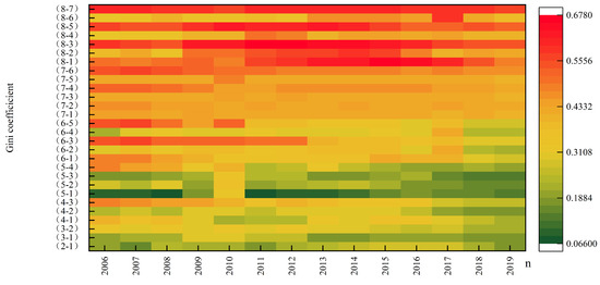 In Figure 7, we also find that the Gini coefficient of (5-4) ((eastern coastal)-MRYAR) had the most obvious decline in 2006–2019, down from 0.4763 to 0.2713, with an average annual decline rate of 4.38%. Compared with (5-4) ((eastern coastal)-MRYAR), the other inter-regional Gini coefficient did not change significantly during the study periods.