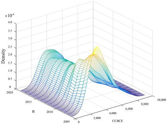 In 2006–2010, the kernel density curve showed a leftward shift, and the height of the peak dropped significantly over time. This reflects the differences of CCBCE increasing obviously during the 11th FYP period.