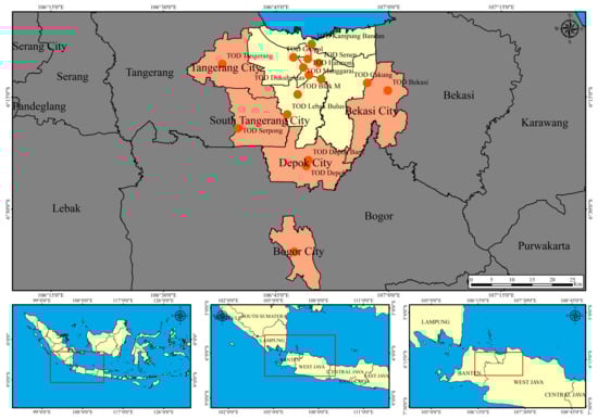Overall, this study contributes to the existing literature by focusing on two TOD impacts, including changes in commuters’ travel behavior and land-use and spatial distribution [] in the Jakarta metropolitan area. It fills a gap in the TOD literature regarding the lack of a longitudinal study []. Furthermore, this study supports [] with an eight-year lapse since the inclusion of the TOD concept in 2012 within the Jakarta 2030 Regional Spatial Plan. First, it aimed to examine the progress and barriers to TOD implementation. Second, this study aimed to determine changes in commuters’ mobility through a survey of 400 respondents and land-use spatial distribution via the geographic information system within the several TOD areas in the Jakarta metropolitan area. It used the 2013 and 2020 data to determine how these changes were influenced by TOD-related developments. Third, this study aimed to establish appropriate policy recommendations on how the Jakarta and national governments should pursue TOD or alternative policies to achieve sustainable urban transportation and development.