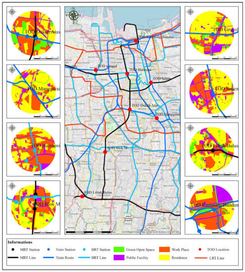 Eight TOD areas were selected as samples for the following reasons. Six of them, i.e., Dukuh Atas, Manggarai, Harmoni, Senen, Blok M, and Grogol were included within the 2030 Jakarta Regional Spatial Plan. The other two areas, Lebak Bulus and Kampung Bandan, were specifically planned as TOD-based MRT Stations (Figure 2).