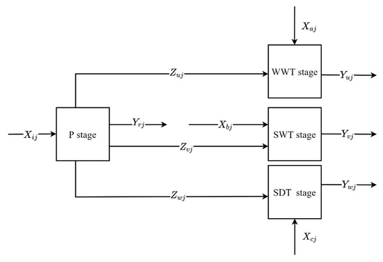 For In the P stage, input resource produces desirable output and undesirable intermediate output , , . In the WWT stage, input processes to produce an undesirable output . In the SWT stage, input will treat to obtain the desirable output . In the SDT stage, input with to produce an undesirable output . According to the measurement method of efficiency, DEA model can be divided into three types: input-oriented model, output-oriented model, and non-oriented model. Input-oriented focuses on reducing input factors as much as possible to achieve efficiency without reducing output, while output-oriented focuses on increasing output level as much as possible without increasing input factors to achieve efficiency [60]. To avoid bias, our model adopts a non-oriented form, attempting to measure efficiency from both input and output.