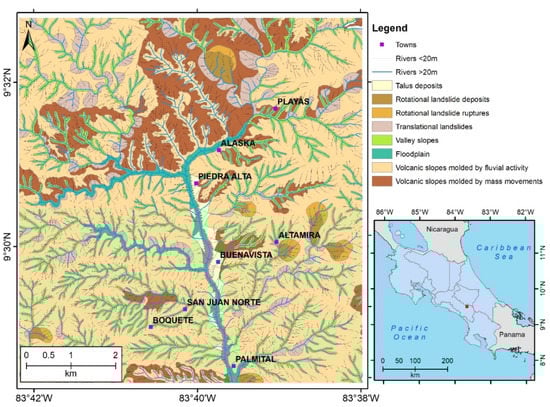 - Quesada-Román, A. Peligros Geomorfológicos: Inundaciones y Procesos de Ladera en la Cuenca alta del río General (Pérez Zeledón), Costa Rica. Maestría en Geografía con énfasis en Geografía Ambiental. Posgrado en Geografía; Universidad Nacional Autónoma de México: Mexico City, Mexico, 2016; p. 157. [Google Scholar] [CrossRef]