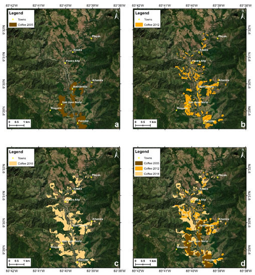 Coffee areas’ growth in 2005 (a), 2012 (b), 2018 (c), and combined (d).