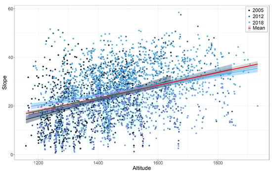 Coffee croplands increased mostly on landslide slopes (347.28%) and volcanic slopes (154.36%) molded by fluvial activity. Because of their dynamics, landslide slopes naturally have less dense vegetation and facilitate the cropping processes, while volcanic slopes are very close to the limit of reported Andisols, so they possess higher soil fertility levels. Other minor areal landforms conditioning coffee growth were the floodplain, active landslides (even with an acute decrease), and talus deposits. There is a clear trend of increasing coffee cropland, in both slope and altitude, during 2012, and especially in 2018 (Figure 3).