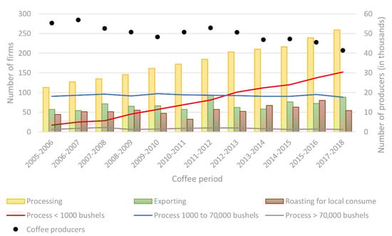 By the year 2019, 93,697 ha were cultivated with coffee in Costa Rica, representing a decrease of 18% compared to 2005. In addition, we also found fewer coffee producers in the same period (−25%; Figure 4). Nonetheless, the number of firms that process raw coffee has increased steadily in the same period by 129%, as well as the exporting and local roasting firms, but they have grown at a slower pace (54% and 23%, respectively).