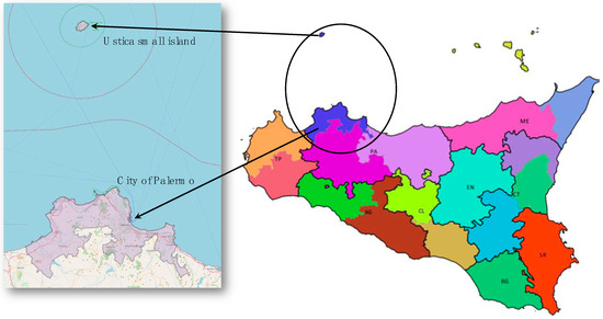 In more detail, the Integrated Waste Management Plan related to the so-called “Ambito Territoriale Ottimale” (ATO) PA3 was considered, which includes the city of Palermo and the small island of Ustica (Sicily, Italy) [23]. Figure 1 identifies the selected territorial area within the entire map of Sicily.