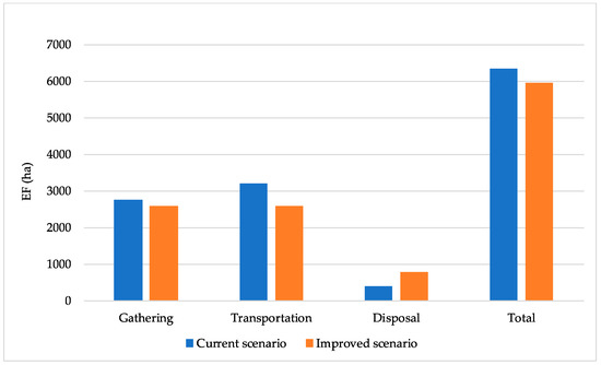 Once the single-impact components have been calculated, the overall EF value can be obtained by simply adding the SFP (ha) values associated with each individual waste management system phase for the Palermo–Ustica land context, as shown in Table 3.