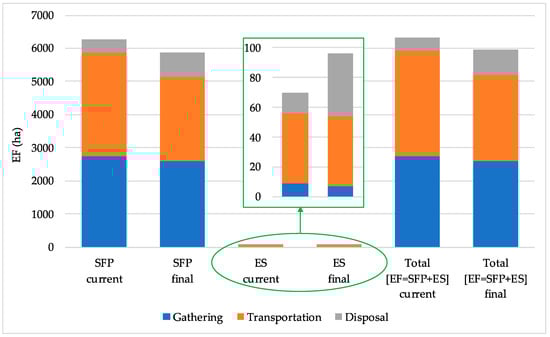 As aforementioned, the EF is expressed in terms of the bioproductive land area required for the entire urban waste management. “Land for energy” (SFP) and “built-up land” (ES) are the categories of ecological surface mainly involved in the application of the EF method in the present case, since soil, pasture, forest, and productive marine areas are not of interest of the analyzed waste system.