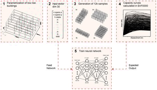 As a first implementation of the proposed method, a typology of low-rise prismatic reinforced concrete (RC) buildings is defined and a training set of more than 7000 structures is parametrically generated. The capacity curves of these models are obtained by means of push-over analysis using SAP2000 software. After defining and training an appropriate neural network model, full capacity curves are predicted in a single run of the network, with a resolution of up to 100 points. This benchmark is substantially higher than previous research that employed less efficient and comprehensive approaches, e.g., one point at a time. The problem with this common approach is not only that it is slower, more tedious and complicated, but also that the information of where the curve ends is completely lost.
