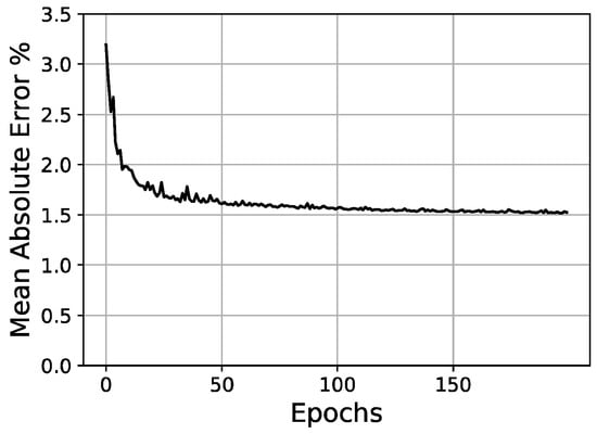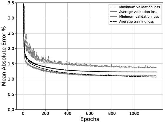 MAE (%)/epoch progress for the minimum, maximum and average results out of the randomized splits is shown in
