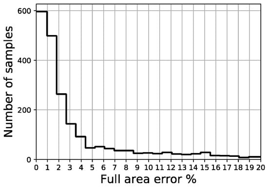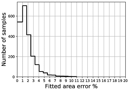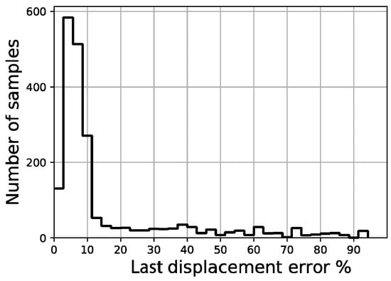 Out of a total of 2200 samples in the validation set, less than 50 samples present a fitted area error above 5.0% and there are no samples above 11.0%, while more than 1200 samples remain below the 2% threshold. Regarding the last displacement error, although most of the samples display an error below 10%, there is a constant spread of this error along the percentage axis all the way up to 100%.