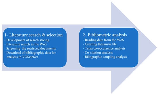 This research was conducted in two major steps. The first step involved scope definition (development of search string) and literature search and selection. The second step was conducting bibliometric analysis using VOSviewer and interpreting the outputs of the bibliometric analysis. These are shown in Figure 1 and will be further explained below.