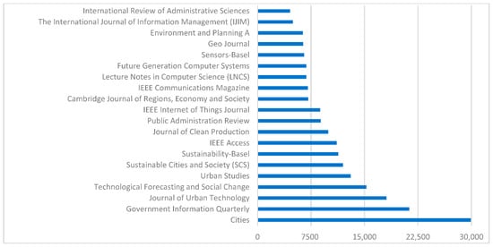 Between the period in relevance to this study (1978–2022), a wide range of journals and publications have emerged focusing on different aspects of smart urban governance, as depicted in Table 1 below. While the table only captures 20 of the most influential journals and publications, that does not suppress the fact that there are other numerous publishing companies concentrating on research works touching on the ‘smartness’ of governance features. In Figure 3 below, the two most influential journals are Cities and Government Information Quarterly, with total link strengths of almost 29,900 and 21,297, respectively. Of interest is that journals with the highest Impact Factor are not necessarily the most influential, as some publish research particularly on issues of cities and governance, with their scope including some of the most influential research areas that have emerged over the entire period of study.