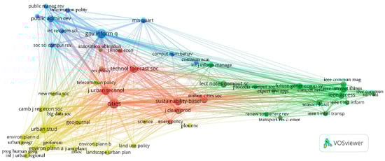 Figure 4 below depicts the different influential journals and publications, including the clusters under which they fall. The publications are clustered into four distinct categories highlighted by blue, red, green and yellow colours. The red cluster comprises journals focusing more on urban sustainability, and it is evident that these subjects are very popular with most researchers, as most journals in this cluster have high linkages with the rest of the categories. The blue cluster comprises journals focusing more on public management and administration in cities. It is evident that the journals publishing works on governments and public administration are very popular, with high linkages to journals with a scope touching on cities and their sustainability agendas. The green cluster comprises journals focusing more on different aspects of Information Technology (IT) and their applicability in different facets of cities. Finally, the yellow cluster encompasses journals focusing on geographical aspects of cities.