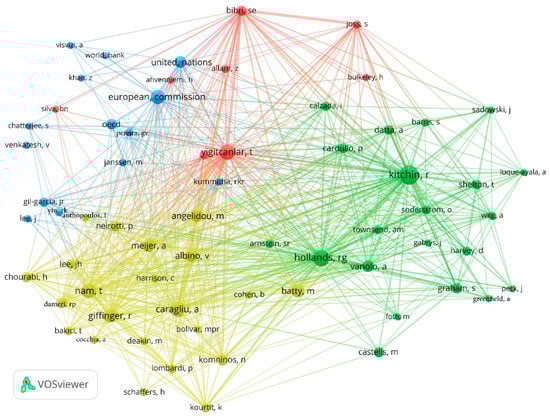 The subject matter of smart urban governance is emotive, as it does not only touch on the political aspirations, but also influences resources allocation in cities, economic growth, and security and privacy of residents and their properties, among other issues. As a result, as showcased in Figure 6 below, over the study period (1970–2022) the number of authors with interests on the aspect of smart cities, and by extension, smart urban governance, have continued to increase. These have been pursuing different issues, as highlighted in Figure 6, where different colouration has been adopted to categorize clusters. The red cluster encompasses authors focused on sustainability and how this is being applied in smart cities. The blue cluster comprises authors whose work majors on policies, frameworks, and structures of smart cities and how this could help in achieving smart urban governance. The yellow and green clusters comprise the most influential authors, as captured in Table 2 above. Those in the yellow cluster have published most works focusing on the general aspects of smart cities, while those in the green cluster are focused more on smart urban governance and how this impacts aspects such as citizen participation and city performance. They have also focused on the possible shortcomings that could be experienced in smart cities where aspects of smart governance are fully considered.