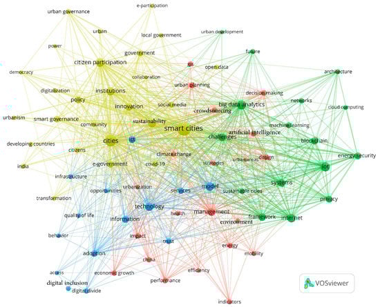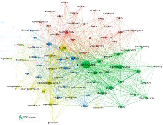 As one of the objectives of this study was to find out how the field has evolved thematically over time, we divided the study period into three sub-periods. This was based on important milestones that could have influenced the evolution of the field. As different international policy frameworks related to cities (e.g., Agenda 2030 and the New Urban Agenda) were adopted in 2015, it was selected as one of the milestones. Additionally, given the significant impacts of the COVID-19 pandemic on cities and its effects on the acceleration of digitalization, the post-pandemic period was considered as a separate sub-period. More sub-periods could have been considered before 2015; however, as can be seen in Section 3, the pace of publications was slow until then, not warranting further sub-periods. Accordingly, the following sub-periods were considered: until 2015, 2016 to 2019, and 2020 until now. Term co-occurrence analyses were conducted for each sub-period to understand their thematic research focus and see how it has evolved over time.