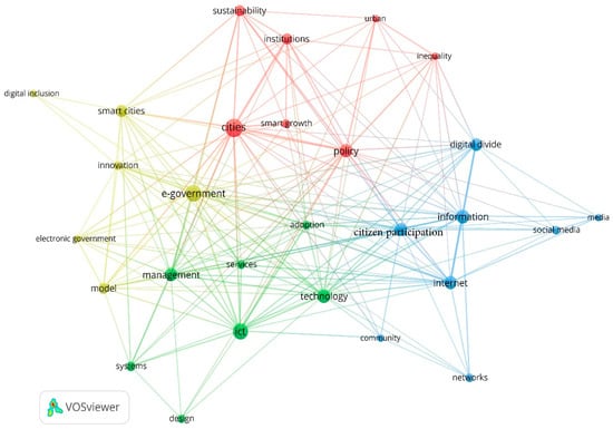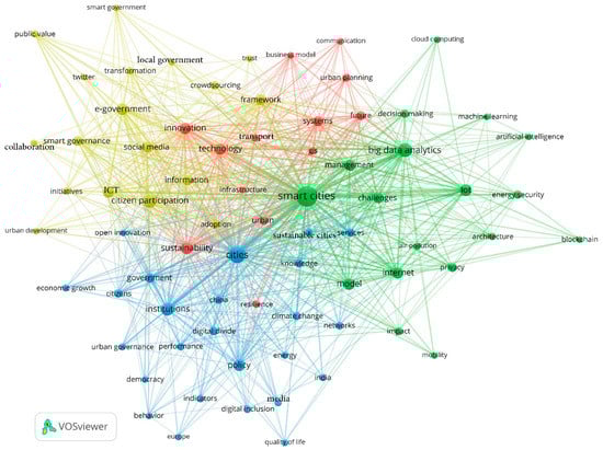 Over the past two decades, several software tools for bibliometric analysis have been developed [44]. These include VOSviewer, SciMAT, and CiteSpace. Despite their differences, all these tools provide means to understand the overall structure of a research field and the complex interactions between different variables related to academic papers (e.g., keywords, references, authors, journals, etc.). Here we used VOSviewer, as its interface is more user friendly and its graphic outputs are more suitable for interpretation [45,46,47,48]. VOSviewer is a freely available Java application (https://www.vosviewer.com, (accessed on the 1 December 2021)). Free access to user manuals and demo projects is provided by the developers and interested readers are referred to the tool manual for step-by-step description of the different steps for analysis. We used VOSviewer to conduct term co-occurrence analysis (using the ‘full counting’ counting method and setting ‘all keywords’ as the unit of analysis), citation (setting ‘documents’ as the unit of analysis), co-citation (using the ‘full counting’ counting method, and setting ‘cited references’, ‘cited sources’, and ‘cited authors’ as units of analysis), and bibliographic coupling (using the ‘full counting’ counting method, and setting ‘organizations’ and ‘countries’ as units of analysis) [28]. It should be noted that ‘fractional counting’ can also be used to create the maps using VOSviewer. We have used ‘full counting’, as its outputs are easier to interpret [48]. We suggest that a similar analysis using fractional counting could also be done in the future to compare the outputs. The term co-occurrence analysis was used to identify the most dominant terms and understand how they are linked to other terms related to smart urban governance. Also, terms that co-occur frequently provide information about major thematic research clusters. It should be mentioned that, as different variants of a term may exist (e.g., Information and Communication Technologies and ICT), before conducting the term co-occurrence analysis, a thesaurus file was created and added to the VOSviewer database to avoid separate counting of synonyms.
