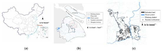 The location and distribution of industrial land in Minhang District, Shanghai: (a) The location of Shanghai in China; The map is based on the standard map from the standard map service website GS (2019) No. 1651 of the Ministry of Natural Resources, China (http://bzdt.ch.mnr.gov.cn/index.html, accessed on 27 April 2020), and the base map boundary is not modified. (b) The location of Minhang District in Shanghai. (c) The distribution of industrial land in Minhang District.