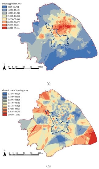 Kriging interpolation of the housing price and its growth rate: (a) The spatial distribution of the housing price in 2015; (b) The spatial distribution of the housing price growth rate from 2015 to 2019.