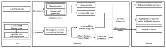 Based on the aforementioned data, this study manifested differences in location and characteristics between L1 and L2 according to a Student’s t-test. Then, the aggregation level between industrial land (L1 and L2) and living quarters (P1 and P2) was examined using the bivariate K-function method. This study also employed an econometric method to explore the influence of several important factors (i.e., land prices, industrial parks’ administrative grades, land-leasing policies, and industrial enterprises’ production efficiency) on industrial land transformation. The framework of the methodology is shown in Figure 3.