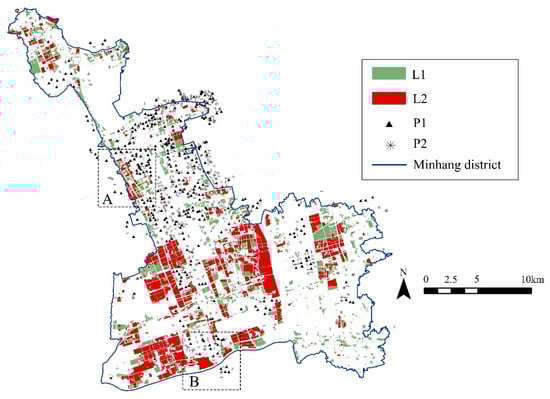 Figure 4 presents the spatial distribution of industrial land (L1 and L2) and living quarters (P1 and P2). L1 was mostly distributed separately and located on the junction area between industrial clusters and other land-use functions. P1 was mainly located near L1 (Zone A in Figure 4) but relatively away from L2 (Zone B in Figure 4).