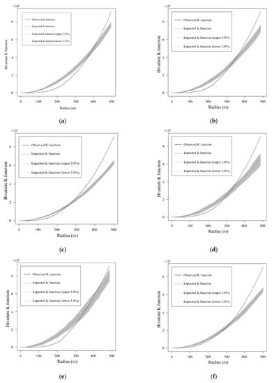 Clustering of industrial land (L1 and L2) and living quarters (P1 and P2): (a) Industrial parcels—Living quarters; (b) L1—Living quarters; (c) L2—Living quarters; (d) L1–P1; (e) L1–P2; (f) L2–P1.